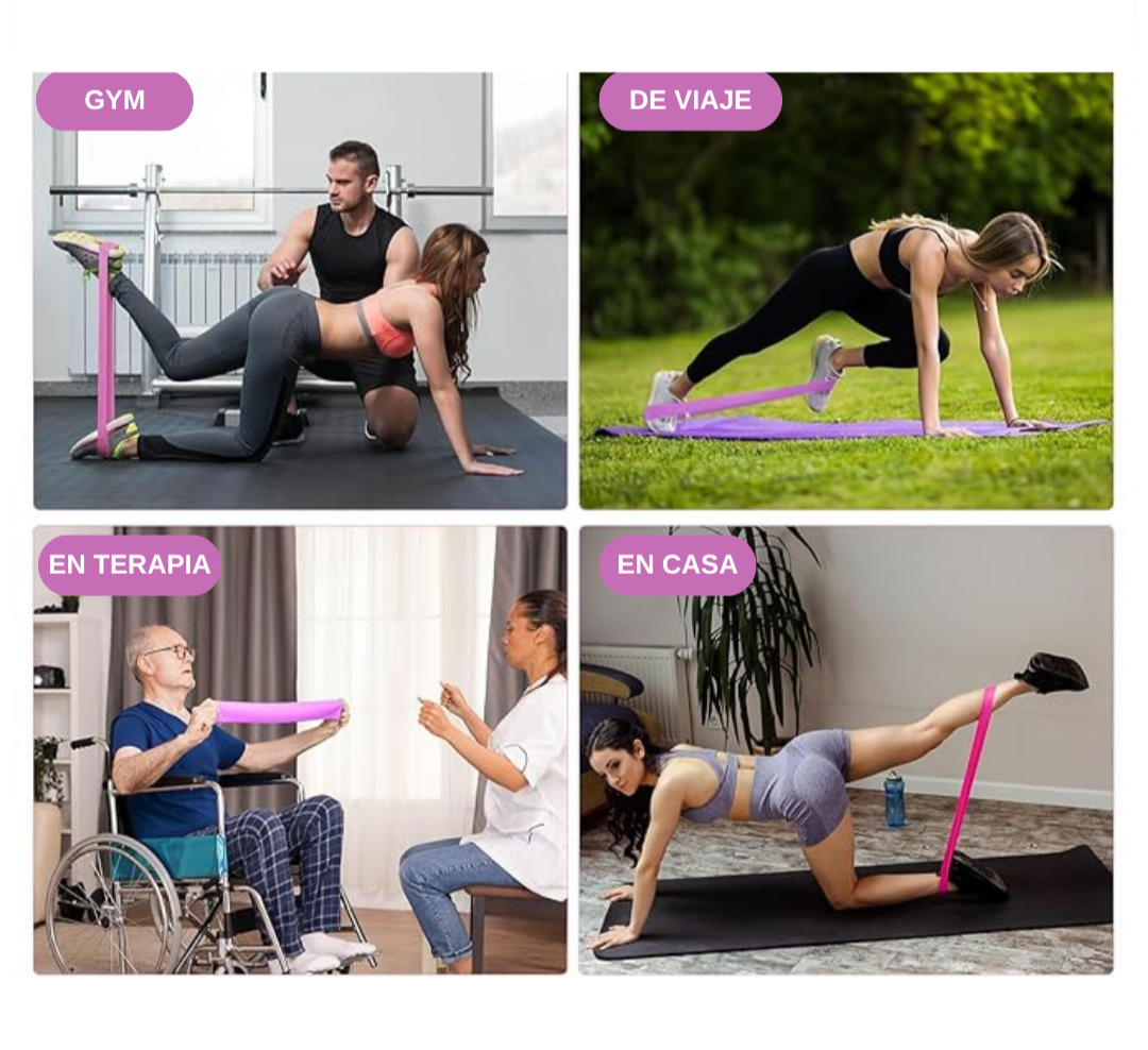 Descubre las bandas de resistencia perfectas para entrenar glúteos, piernas, abdomen, brazos y más, desde la comodidad de tu casa, el gimnasio o donde tú quieras. Diseñadas con tejido premium de algodón elástico y látex natural, son antideslizantes, resistentes y ultra cómodas, ideales para rutinas como Pilates, Crossfit, yoga, tonificación muscular o rehabilitación.